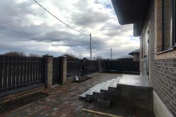 Двор выложен плиткой, откатные ворота, широкий фасад, участок 8 соток.